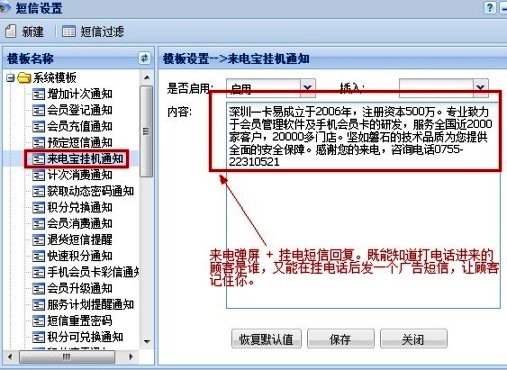 (6)掛機短信通知:顧客來電掛機后,自動短信通知,強化品牌印象,