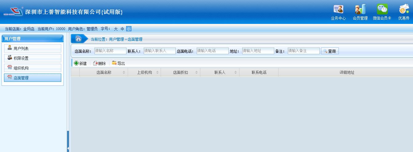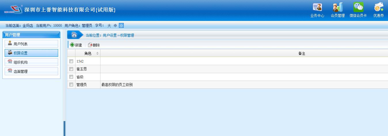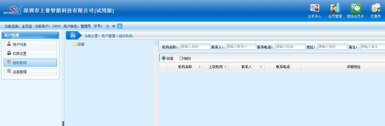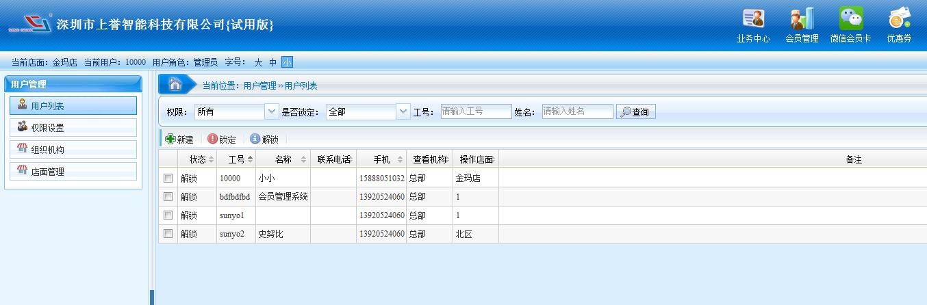 用戶管理功能有:用戶列表、權(quán)限設(shè)置、組織機構(gòu)、店面管理等等。 用戶列表:用于會員管理設(shè)置分賬號使用。