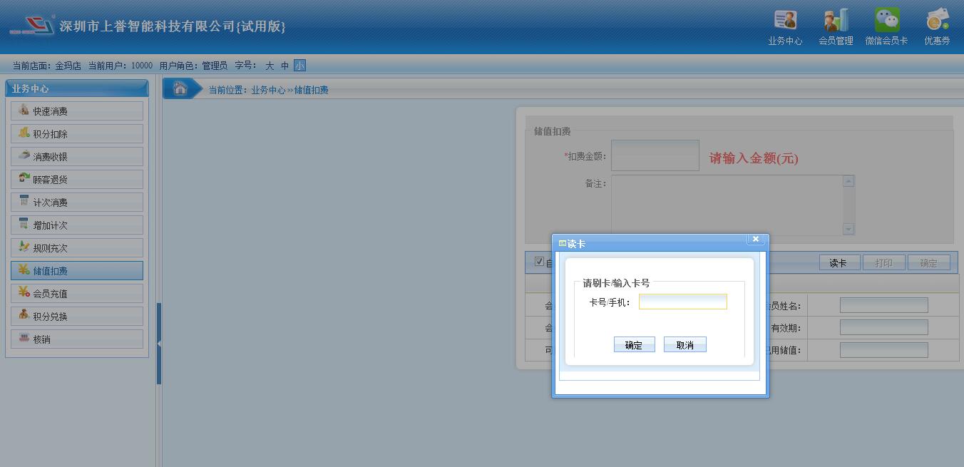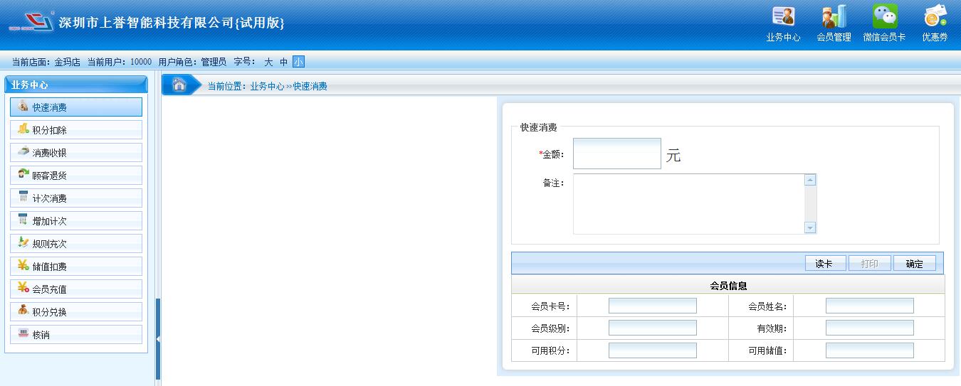 會員管理功能有:快速消費、積分扣除、消費收銀、顧客退貨、計次消費、增加計次、規則充次、儲值扣費、會員充值、積分兌換、核銷等等。