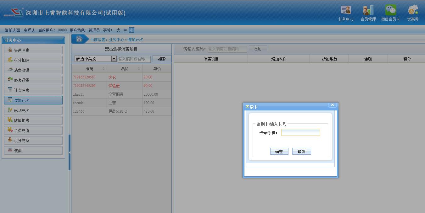 增加計次:用于商品直接增加次數,增加的計次可用來消費等。