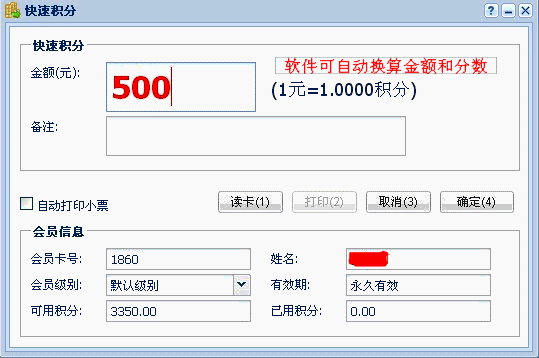 通過消費積分累計,讓會員客戶真正得到實惠,享受到尊貴的增值服務,進而形成忠誠消費,建立穩固客戶資源。 1、快速積分: 適用于無需記錄會員消費明細,直接累加積分的情況 直接輸入消費金額,軟件自動按照積分比例累加積分(或者直接輸入積分數量獲得積分)。