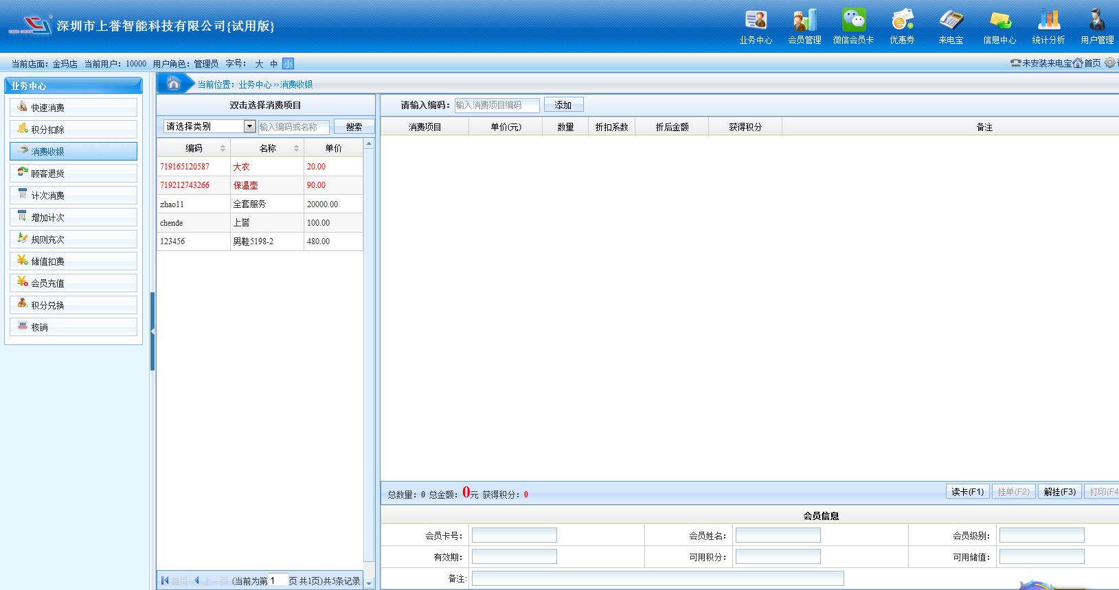 2、散客消費(fèi): 支持正常的收銀業(yè)務(wù)。‘散客消費(fèi)’(即無(wú)卡會(huì)員),無(wú)需讀卡,直接選擇消費(fèi)項(xiàng)目,然后結(jié)賬即可。