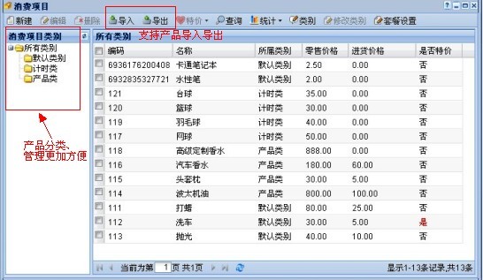 消費項目是作為會員管理軟件的基本功能項,可添加產品并設置產品類別,價格,折扣規則,積分規則,以及是否為特價商品等。